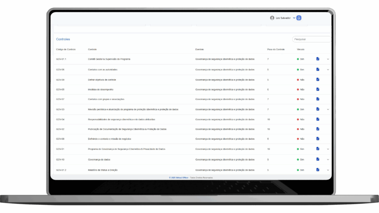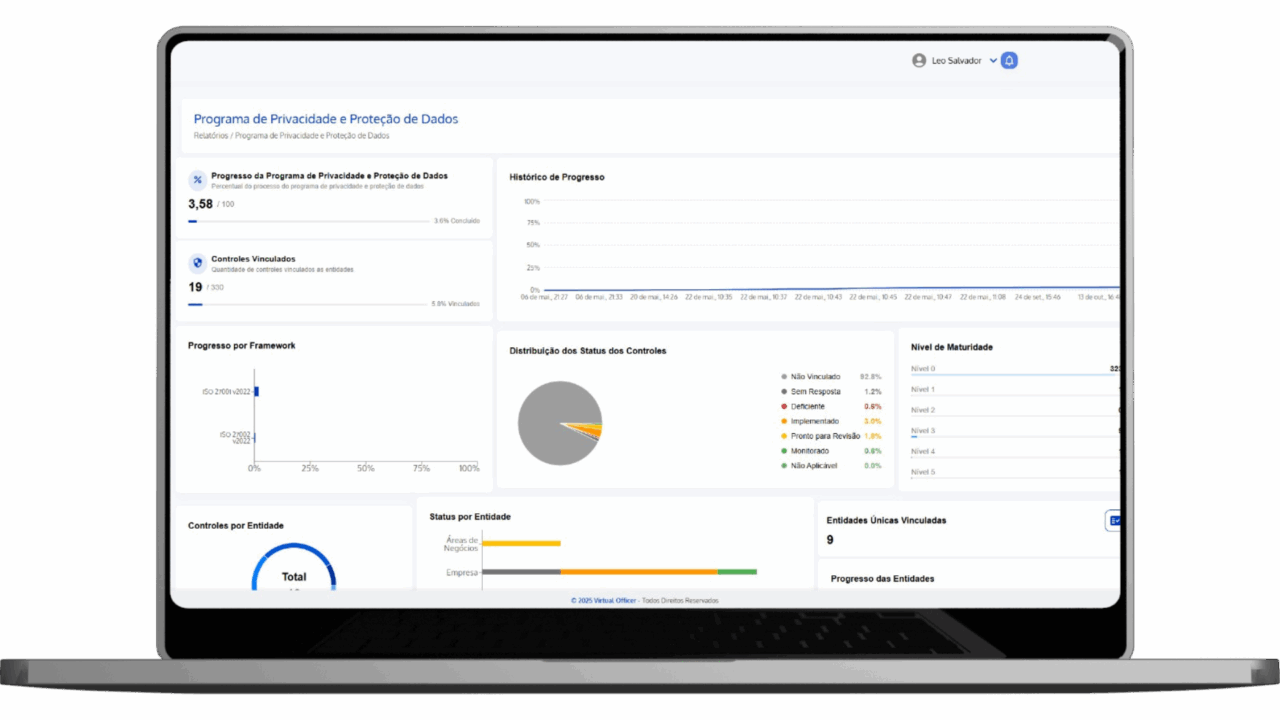 Em vez de lidar com dezenas de ferramentas, planilhas e controles desconectados, você tem tudo em um só lugar: mapeamento de dados, gestão de políticas, análise de riscos, monitoramento da superfície de ataque e relatórios inteligentes.